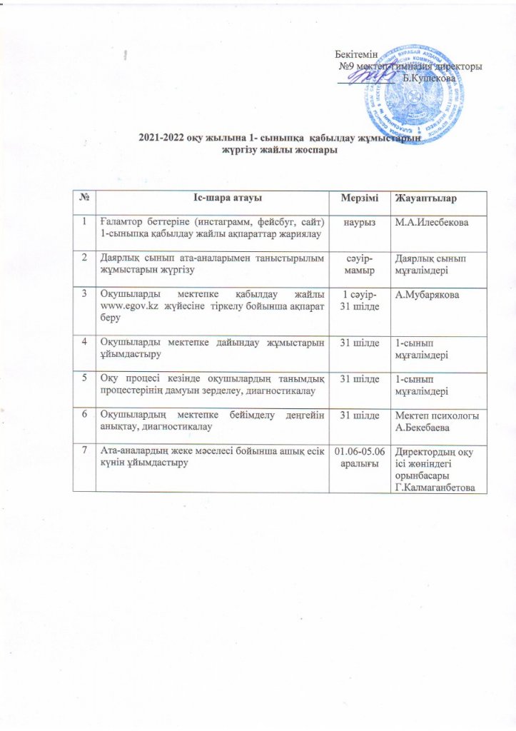 2020-2021 оқу жылына 1-сыныпқа қабылдаужұмыстарын жүргізу жайлы жоспары